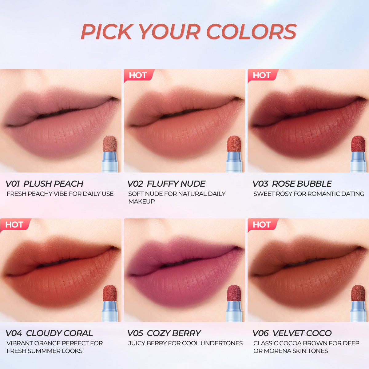 SACE LADY Matte Air Cushion Lip & Cheek Cream delivers a soft, velvet-matte finish with a lightweight, airy texture that blends seamlessly on both lips and cheeks.